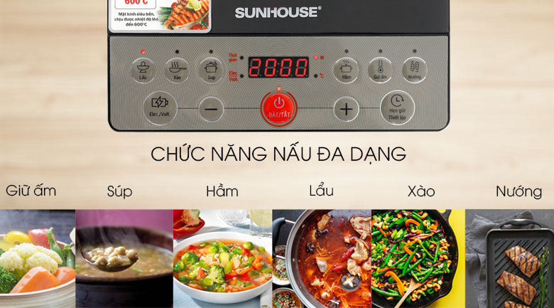 Bếp từ đơn Sunhouse có khả năng gia nhiệt nhanh nhờ mâm từ bằng đồng nguyên chất, hiệu suất hoạt động cao hơn mâm từ bằng nhôm pha đồng. Công suất của bếp đạt 2000W giúp làm nóng và đun sôi món ăn trong thời gian ngắn. Từ trường phát ra làm sinh nhiệt trực tiếp ở đáy nồi, hạn chế tỏa nhiệt, thất thoát nhiệt khi truyền qua mặt bếp và môi trường, tiết kiệm chi phí điện năng cho gia đình.
