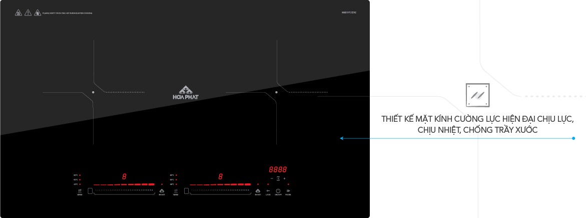 Bếp điện từ đôi Hòa Phát HPCD21A2 được trang bị mặt kính cường lực hiện đại chịu lực, chịu nhiệt tốt, chống trầy xước, dễ dàng vệ sinh.