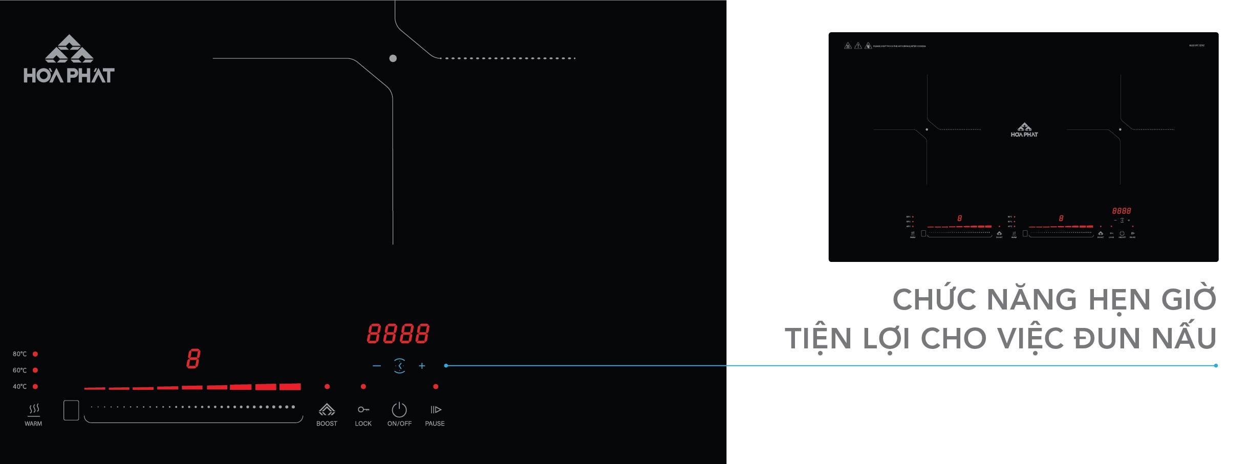 Bếp điện từ đôi Hòa Phát HPC D21A2 tích hợp chức năng hẹn giờ thông minh giúp cho việc nấu ăn đơn giản, không cần phải chờ đợi, canh tắt bếp mà vẫn giữ được độ chín và độ ngon cho món ăn.