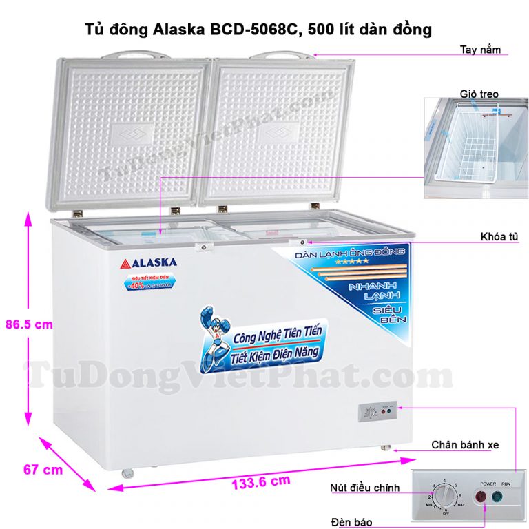 - Tủ Đông Alaska BCD-5068C là tủ đông cỡ trung dung tích 500 lít, thiết kế 2 ngăn, 1 đông 1 mát, 2 nắp mở.