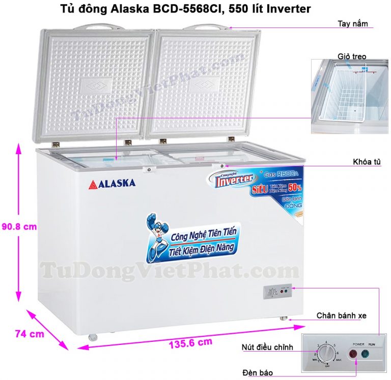 - Tủ Đông Alaska BCD-5568CI là tủ đông cỡ trung dung tích 550 lít, thiết kế 2 ngăn, 1 đông 1 mát, 2 nắp mở.