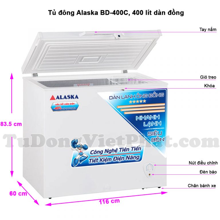 - Tủ Đông Alaska BD-400C là tủ đông cỡ trung dung tích 400 lít, thiết kế 1 ngăn đông, 1 nắp mở.