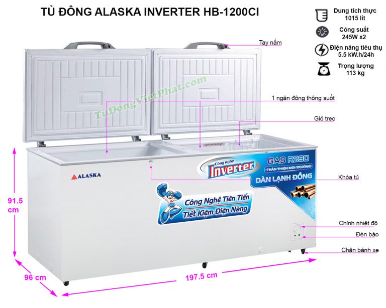 - Tủ Đông Alaska HB-1200CI là tủ đông Inverter cỡ lớn dung tích tổng/ sử dụng 1200L / 1015L, thiết kế 1 ngăn đông, 2 nắp mở.