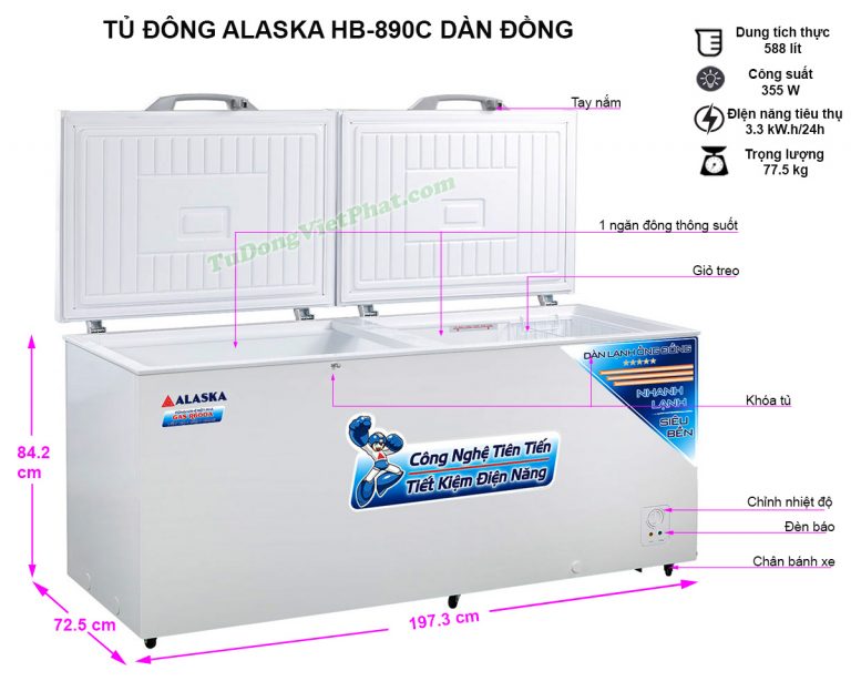- Tủ Đông Alaska HB-890C là tủ đông cỡ lớn dung tích 890 lít, thiết kế 1 ngăn đông, 2 nắp mở.