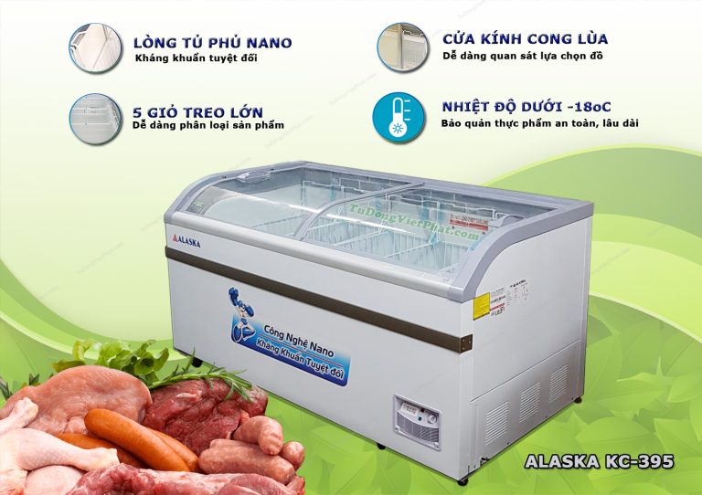 - Tủ đông Alaska KC-395 là tủ đông trưng bày với 2 cánh kính cong lùa chịu lực. dung tích / sử dụng 500L/ 395L, lòng tủ phủ Nano, kháng khuẩn tuyệt đối