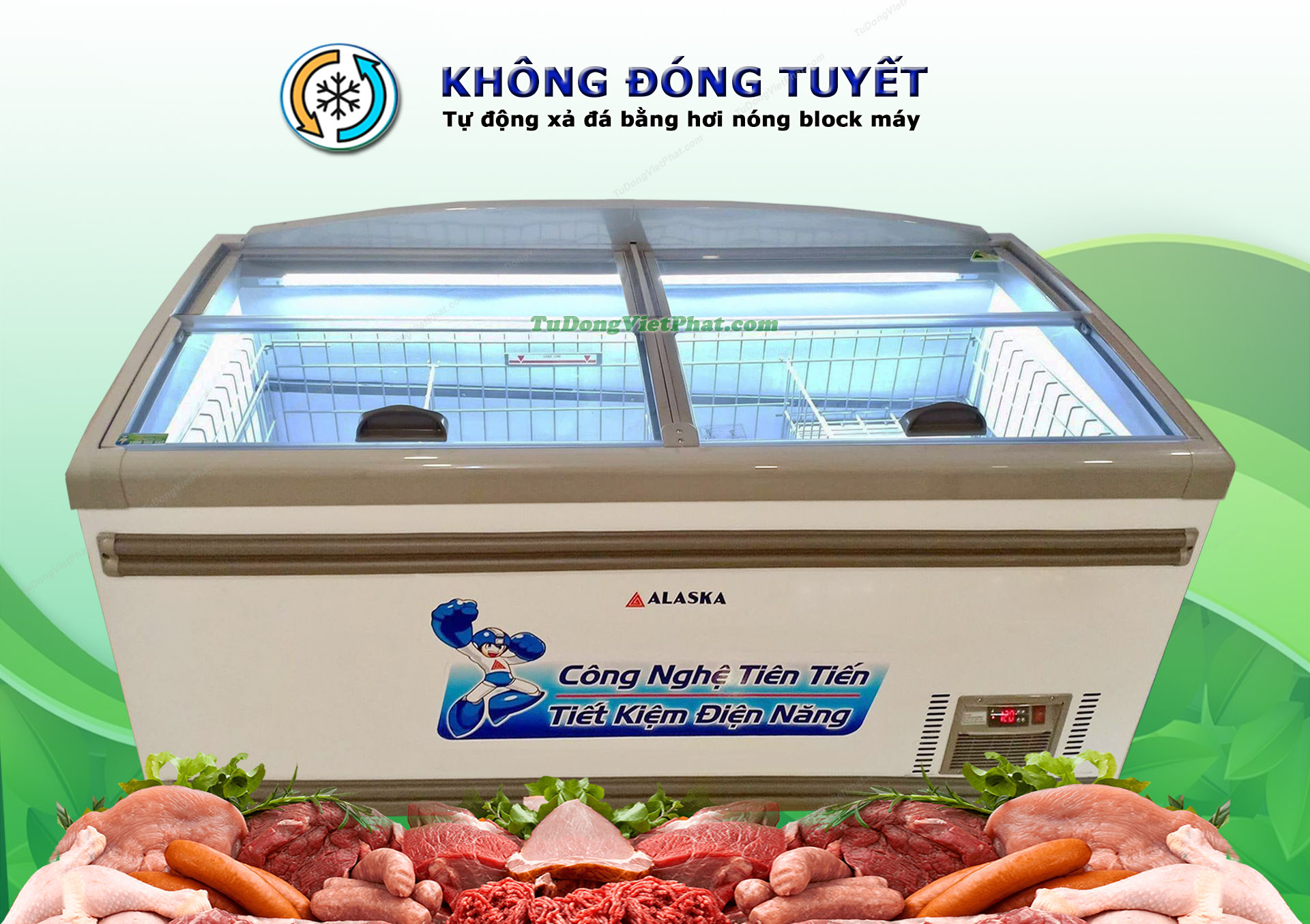 - Tủ đông Alaska KT-450 là tủ đông trưng bày với 2 cánh kính phẳng lùa chịu lực dung tích 450 lít