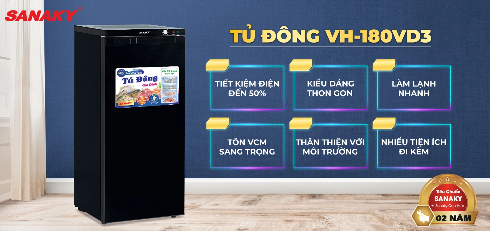 - Tủ đông đứng Sanaky VH-180VD3 được thiết kế kiểu tủ đứng 1 ngăn đông dạng đứng với 1 cánh mở, có thiết kế nhỏ gọn với kích thước 554 x 573 x 1252 (mm)