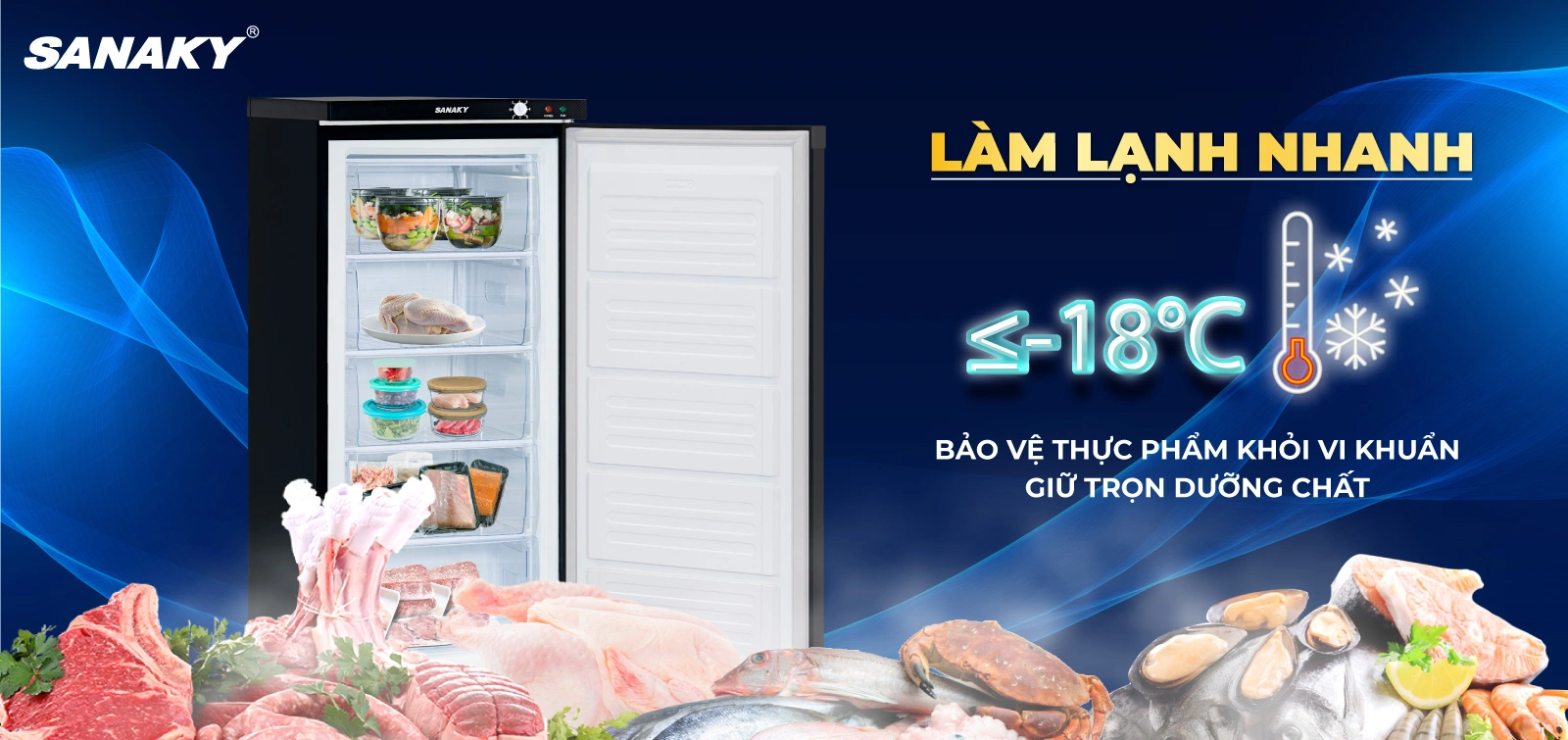 Ở nhiệt độ dưới ≤-18°C thực phẩm được bảo quản trong điều kiện đông lạnh sâu, phù hợp với nhu cầu bảo quản một số thực phẩm như thịt, cá, rau củ,…trong thời gian dài.