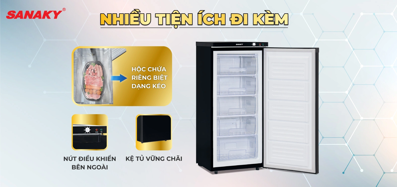 Tủ đông đứng Sanaky VH-180VD3 thiết kế với 5 hộc chứa dễ dàng cho việc vệ sinh và sắp xếp thực phẩm, dễ sử dụng, hạn chế thoát nhiệt, tiết kiệm điện năng. Đặc biệt hơn, với sản phẩm tủ đông này, các hộc chứa được thiết kế theo dạng ngăn kéo, rất tiện lợi với việc cất giữ thực phẩm.