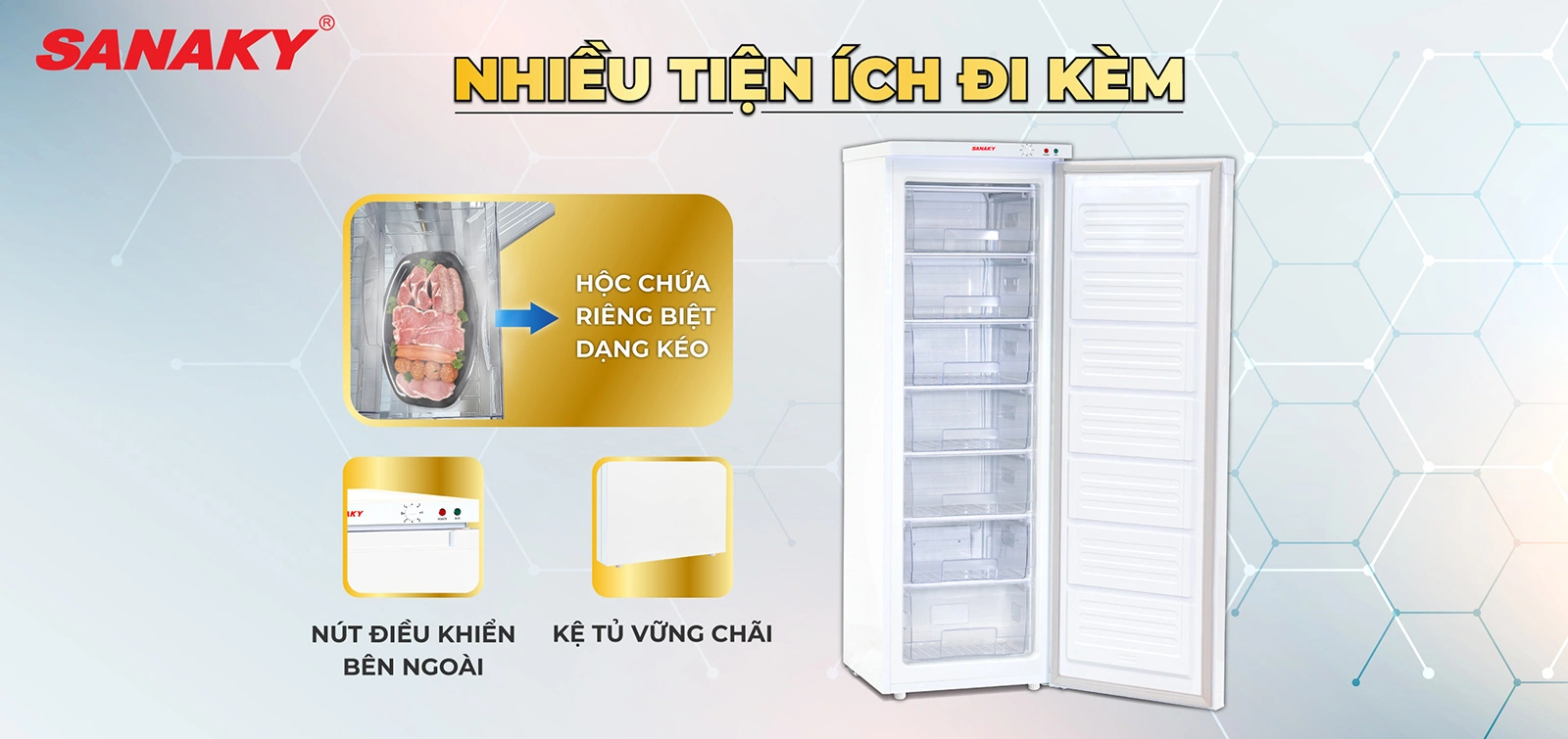 Tủ Đông Sanaky VH-230VD có thiết kế với 7 hộc chứa dễ dàng cho việc vệ sinh và sắp xếp thực phẩm, dễ sử dụng, hạn chế thoát nhiệt, tiết kiệm điện năng. Đặc biệt hơn, với sản phẩm tủ đông này, các hộc chứa được thiết kế theo dạng ngăn kéo, rất tiện lợi với việc cất giữ thực phẩm.
