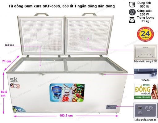 - Tủ đông Sumikura SKF-550S/JS là tủ đông dung tích sử dụng 550 lít thiết kế 1 ngăn đông 2 cánh